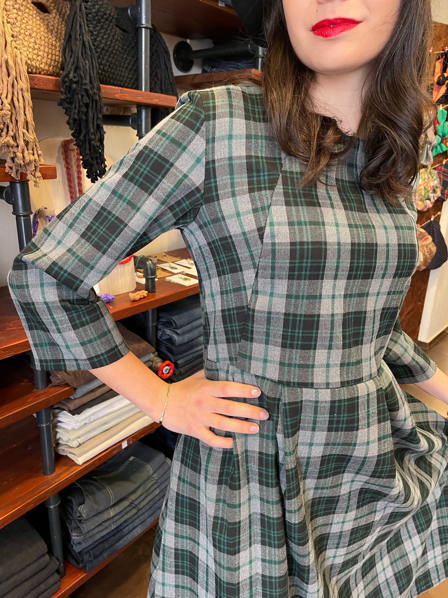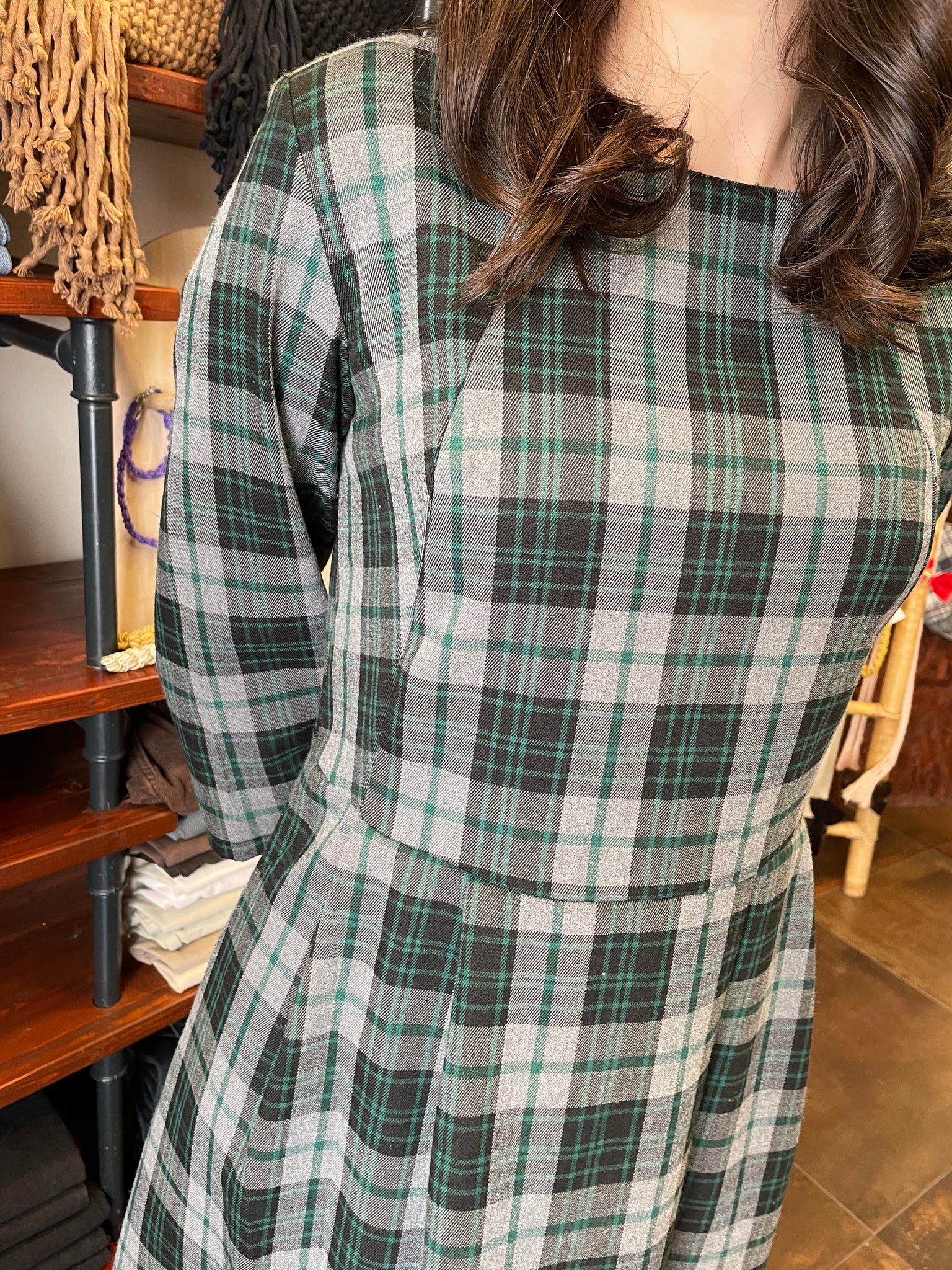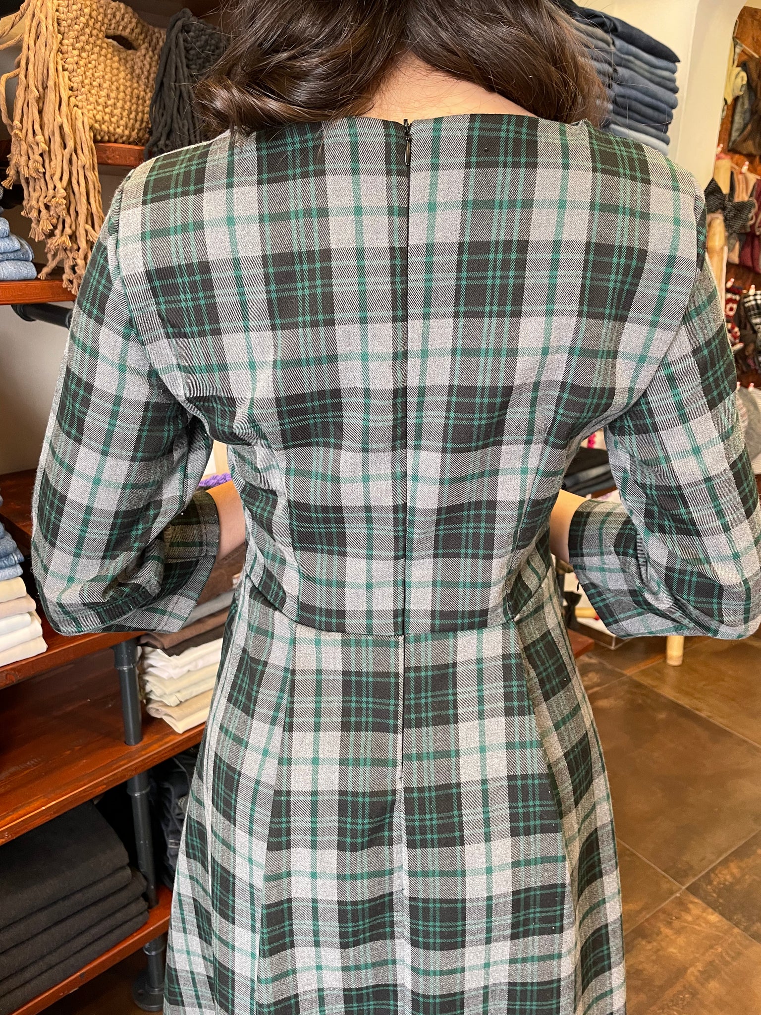 Abito tartan grigio e e verde, manica 3/4, zil posteriore. Stretto in vita con ampia gonna.