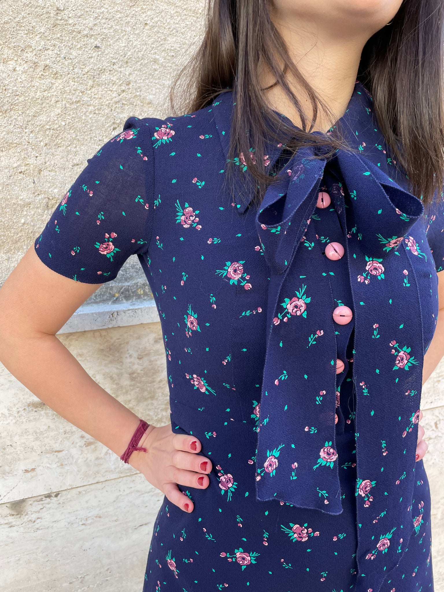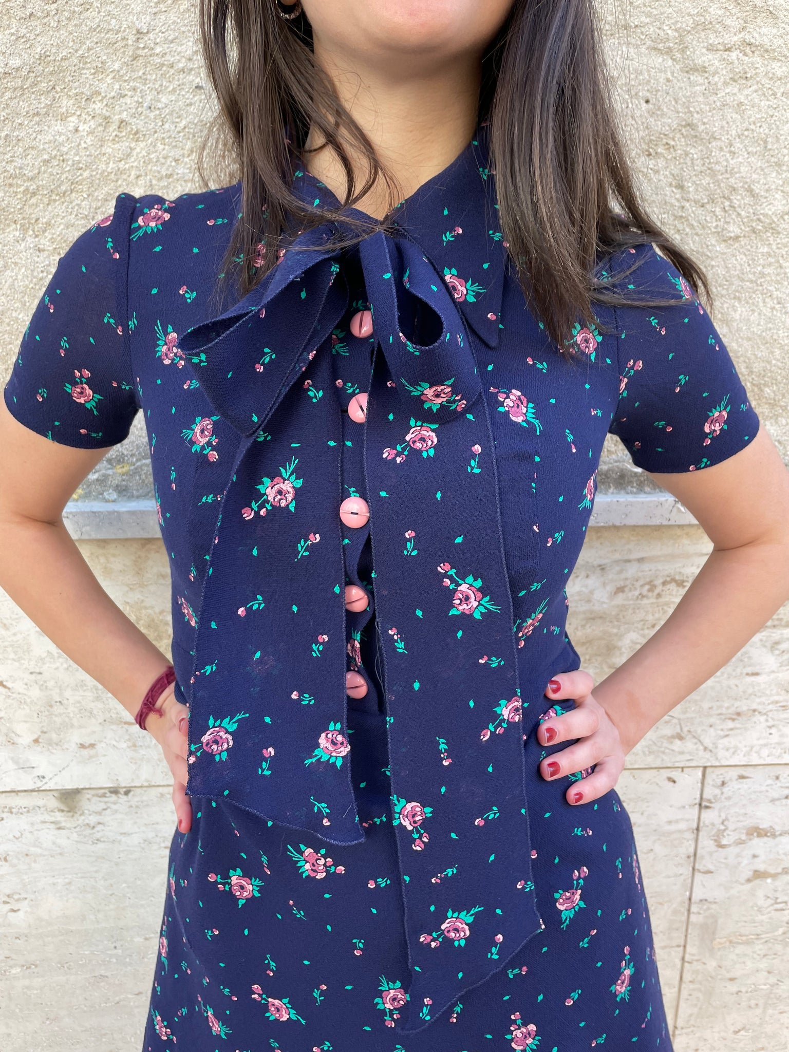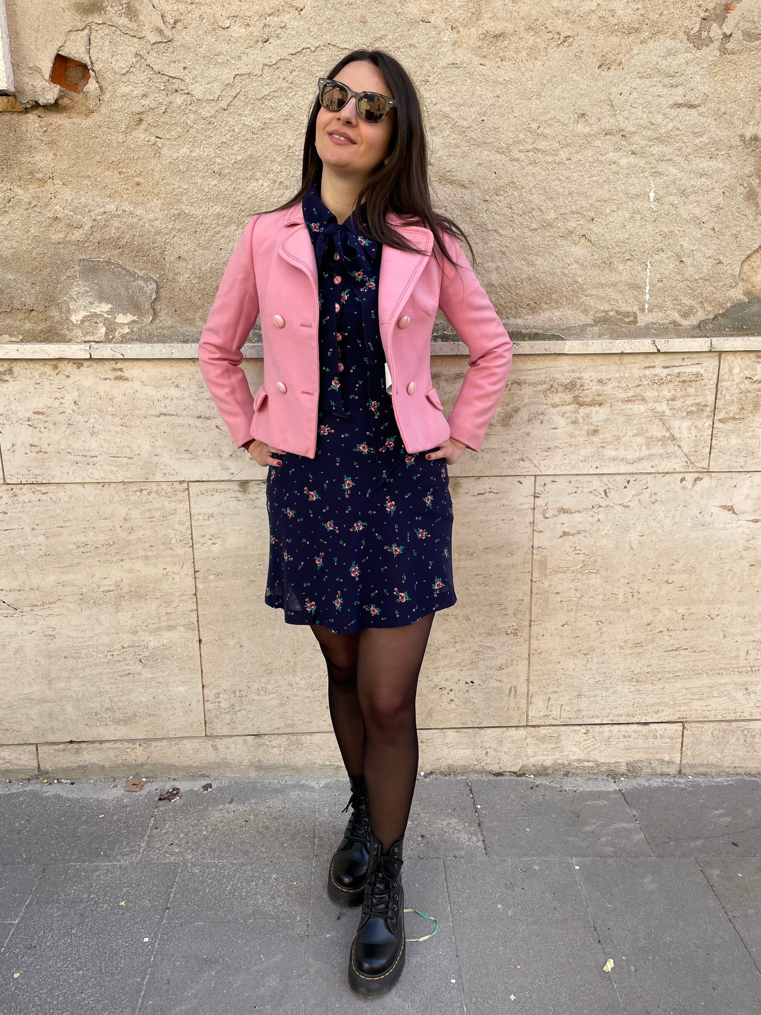 Completo non vendibile separatamente composto da abito blu con fantasia floreale rosa con fiocco sul collo a punta e bottoni rosa frontali. Zip laterali e foderato. Giacca doppio petto rosa abbinata e foderata. Finte taschine frontali.
