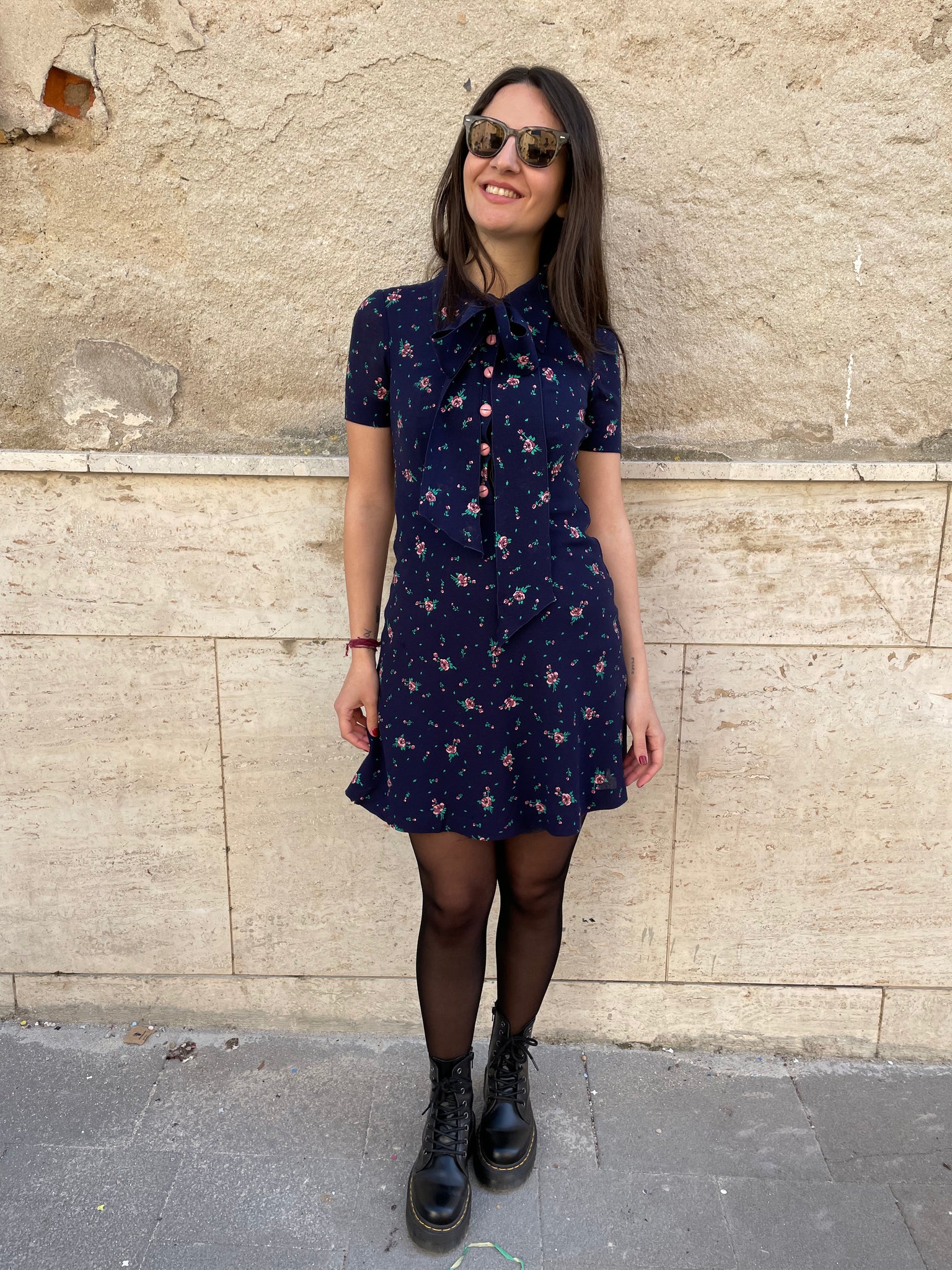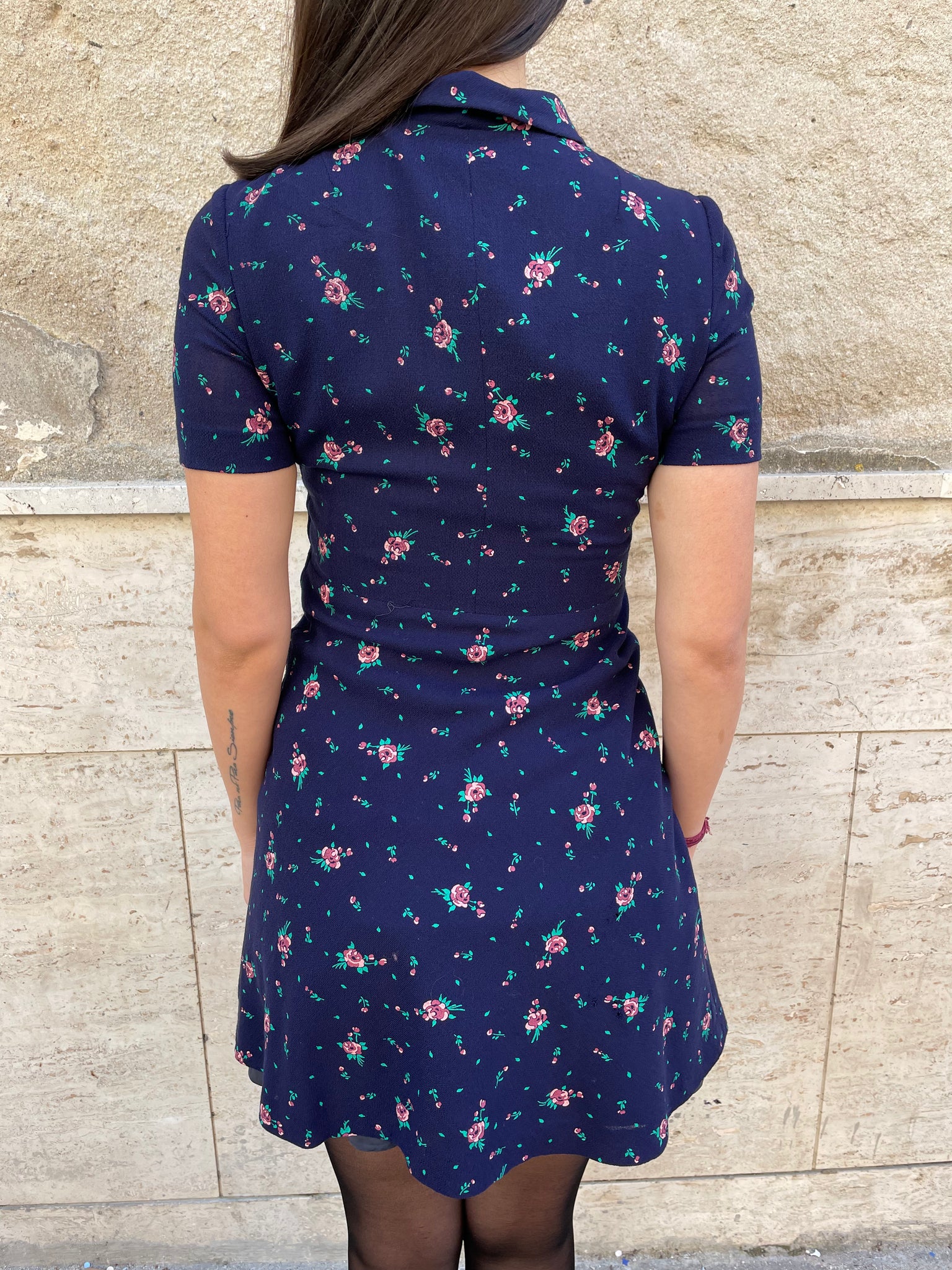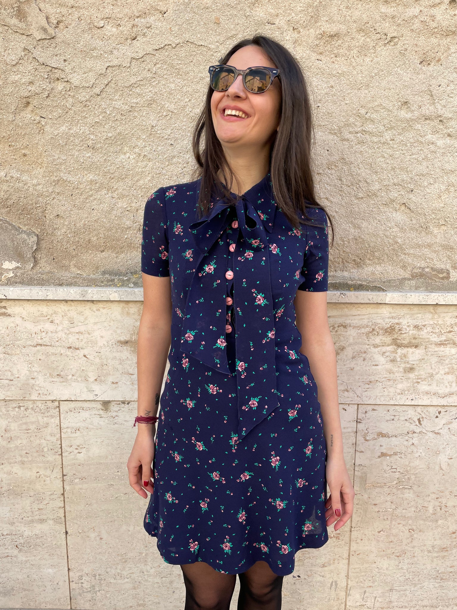 Completo non vendibile separatamente composto da abito blu con fantasia floreale rosa con fiocco sul collo a punta e bottoni rosa frontali. Zip laterali e foderato. Giacca doppio petto rosa abbinata e foderata. Finte taschine frontali.