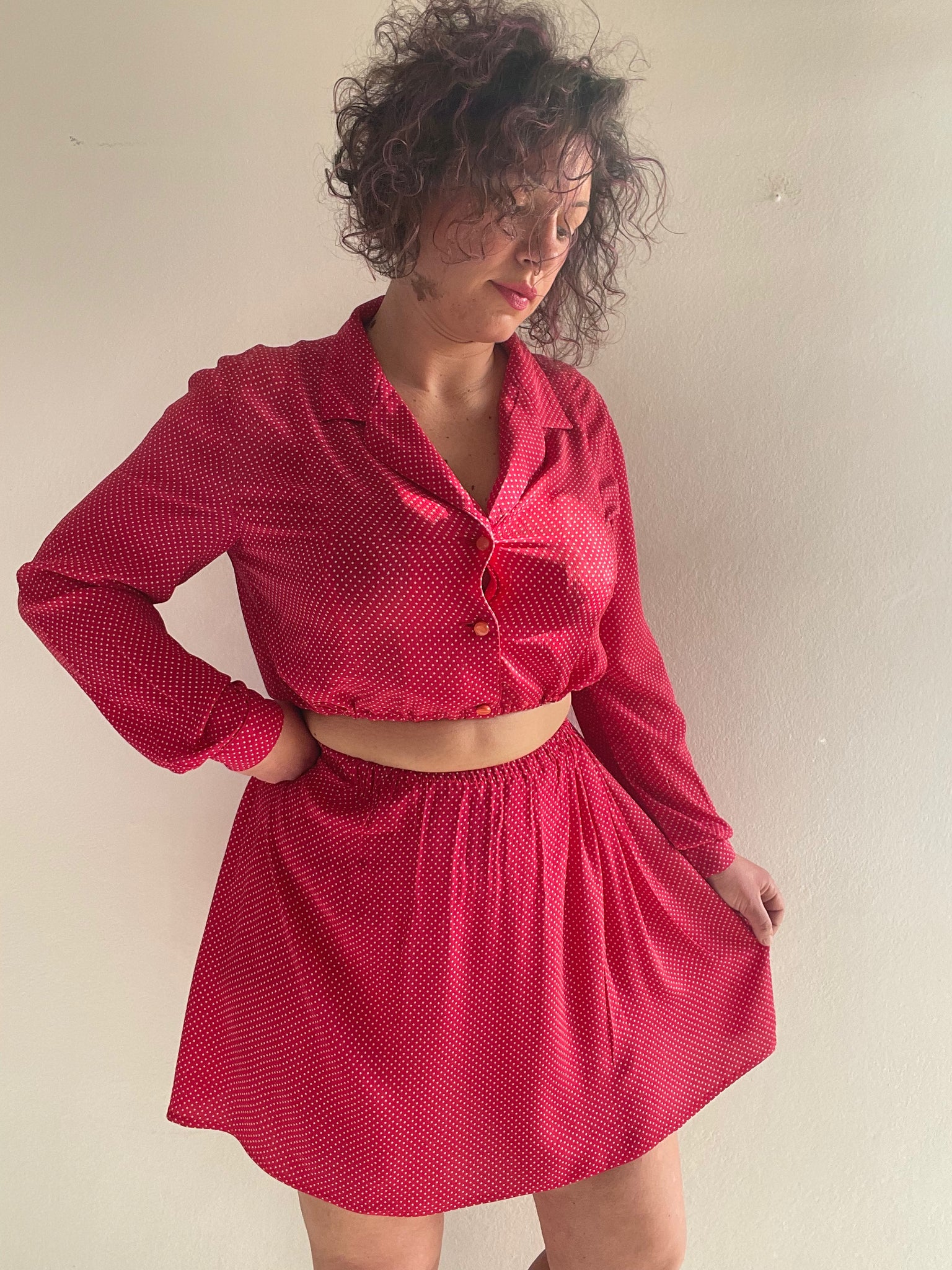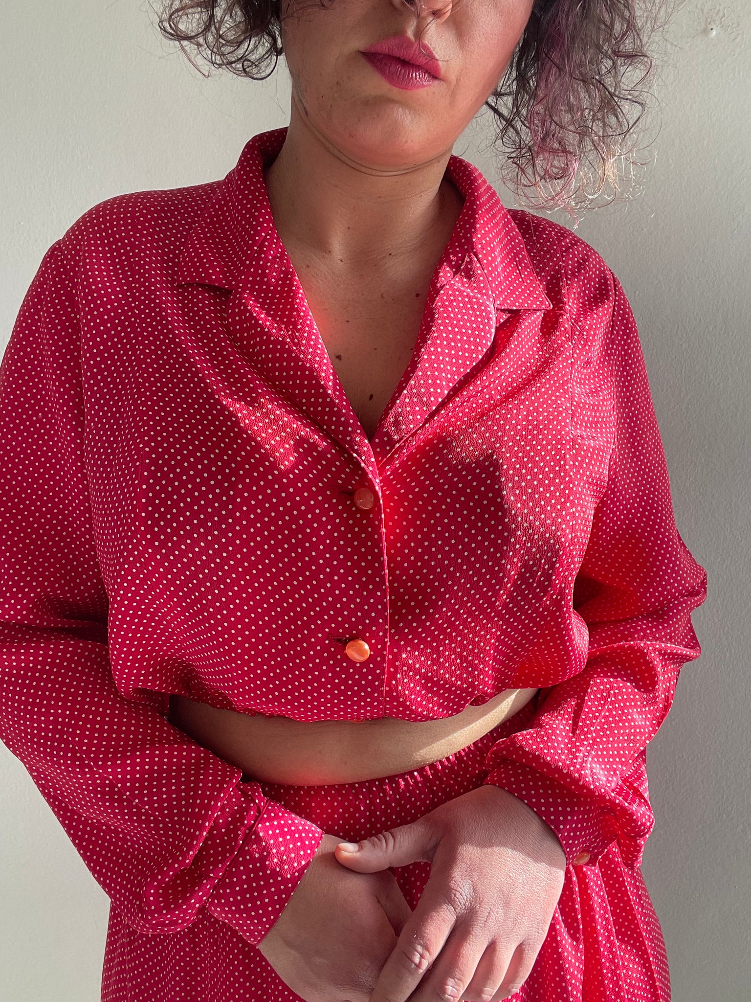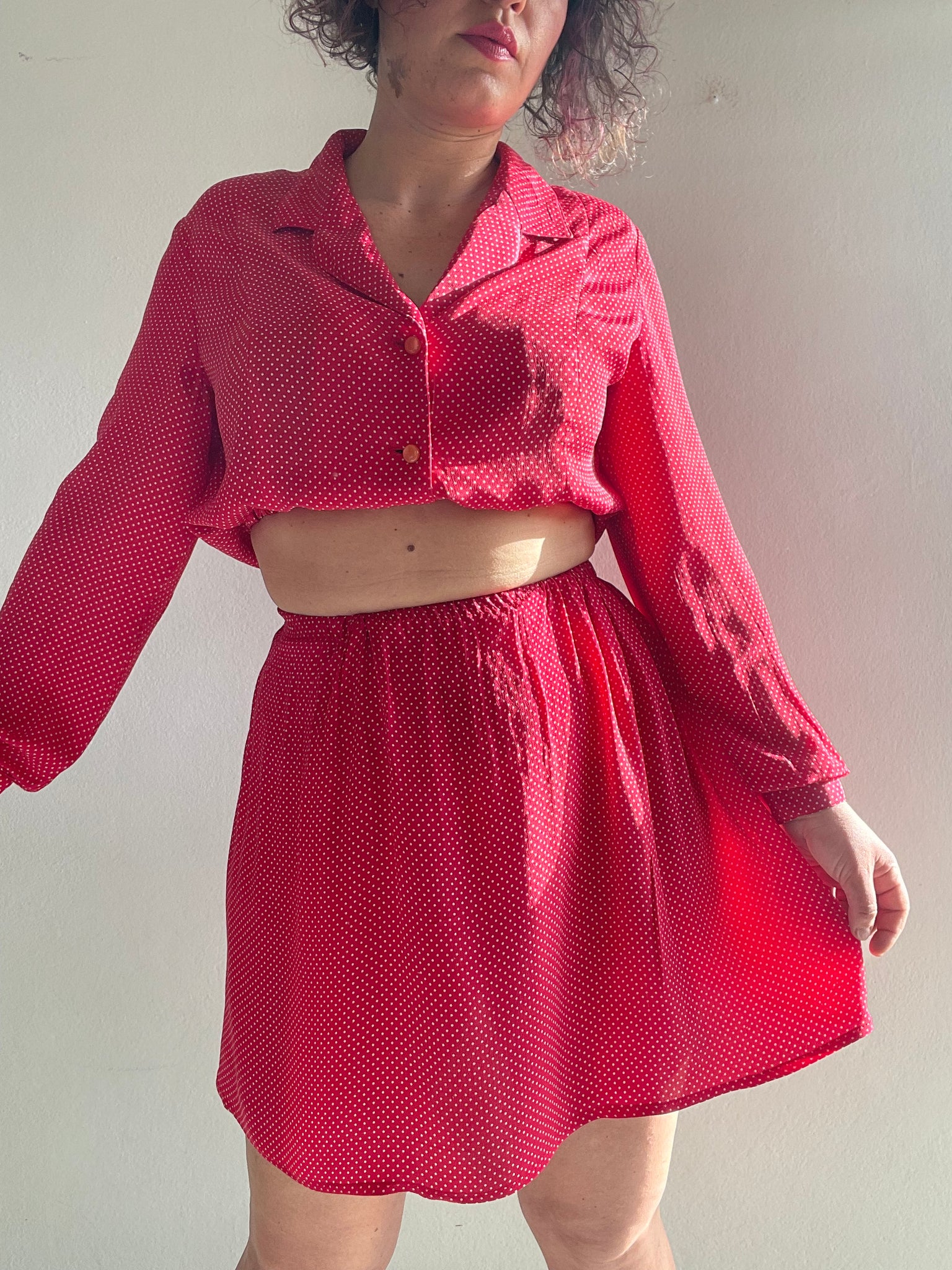 Completo rosso con pois bianchi. Colletto e bottoni frontali. Elastico in vita.