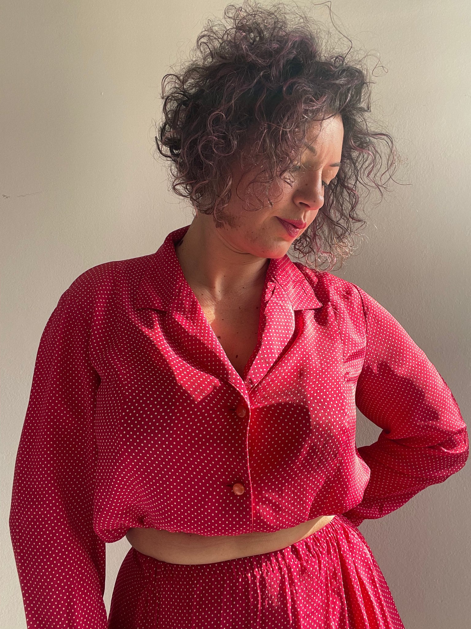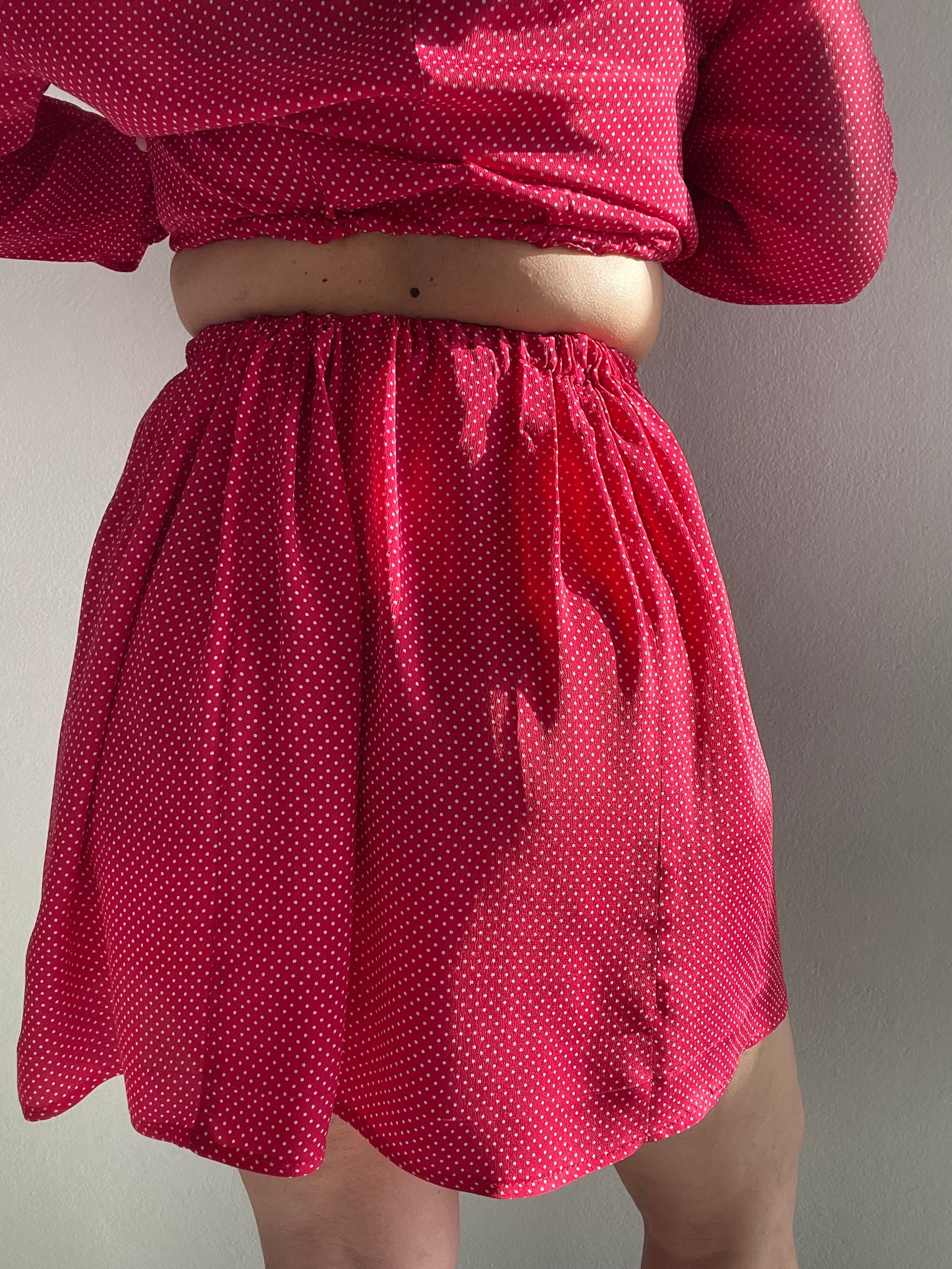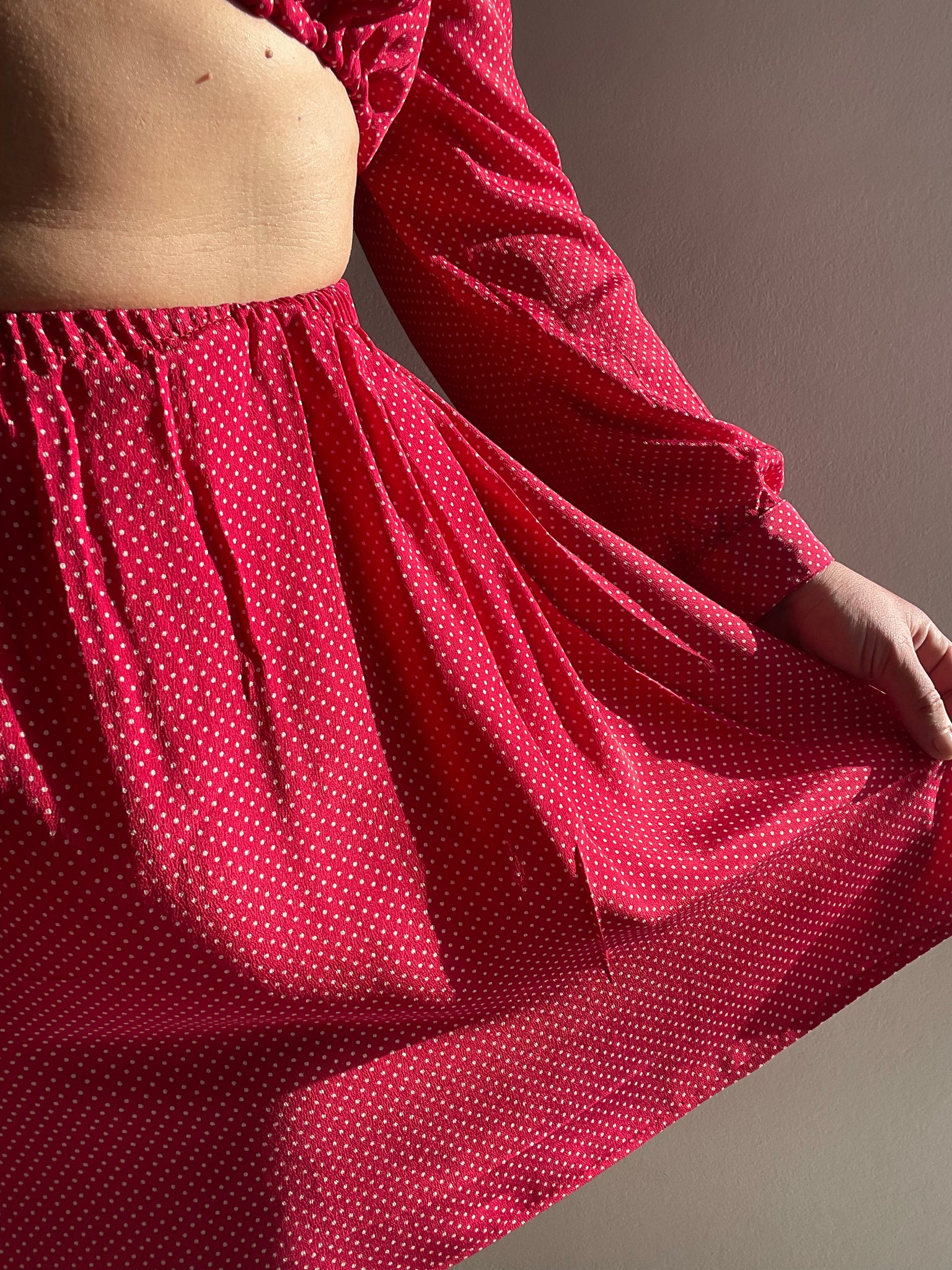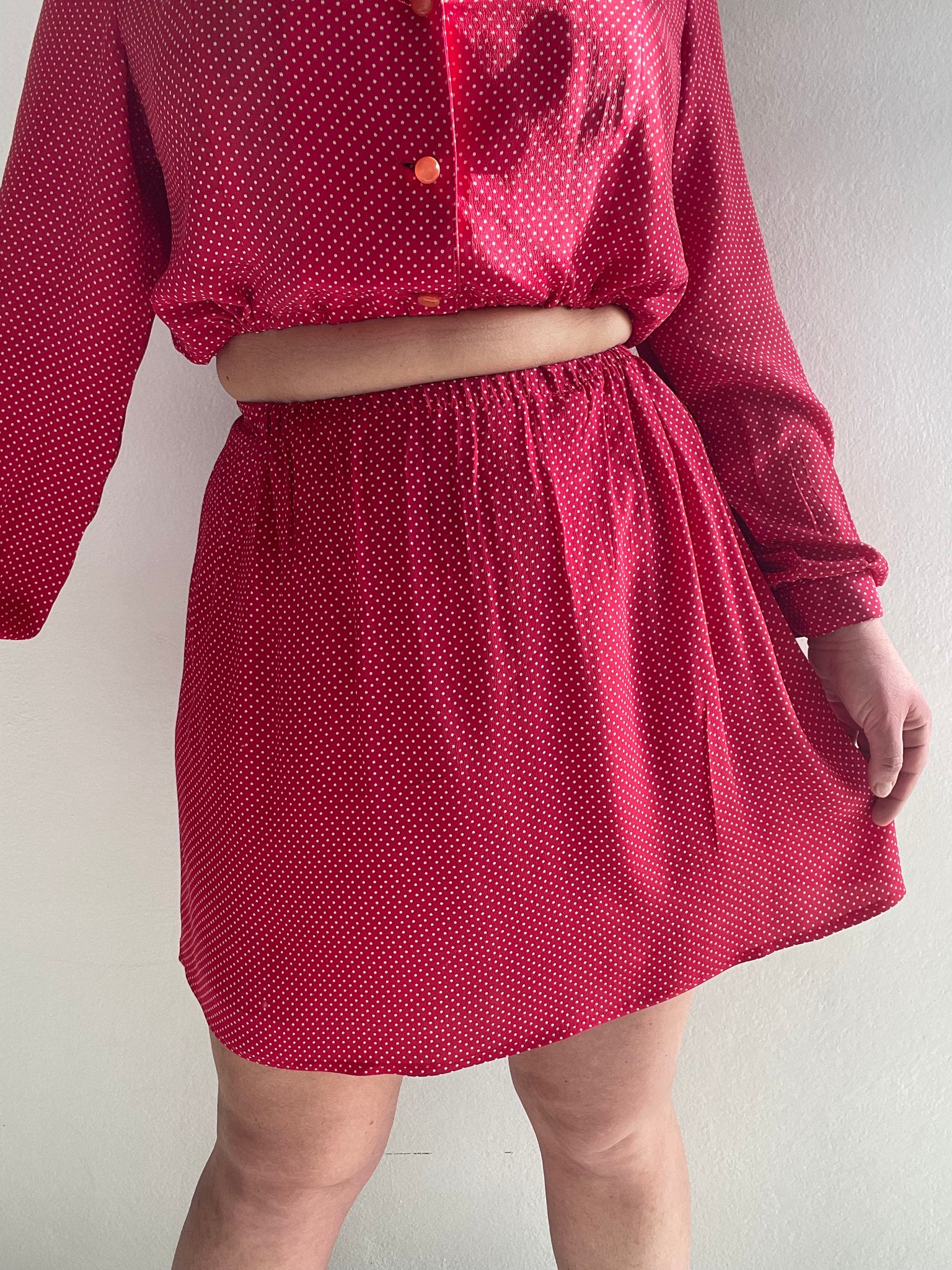 Completo rosso con pois bianchi. Colletto e bottoni frontali. Elastico in vita.