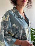 Camicia hawaiana celeste con fantasia floreale chiara. Abbottonatura maschile.
