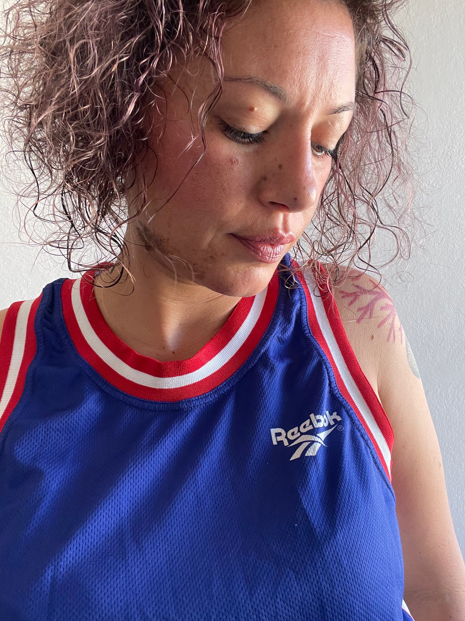 Crop top Reebok blu elettrico con bande rosse e bianco. Elastico in vita.